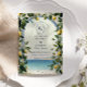 Elegante invitación a la boda de la costa amalfitana con limones acuáticos, exuberante vegetación y románticas vistas al mar. Ideal para una boda italiana de destino, celebración mediterránea o ceremonia de verano en el jardín. Personalizable completo con sus nombres, fechas y detalles de eventos para un aspecto atemporal y vibrante.