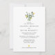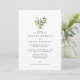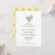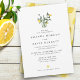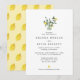 Invitación de boda con limones acuarela simples y elegantes, cítricos y follaje en un arreglo de tarro con fuente clásica abajo. En el reverso de la invitación hay un patrón de limón acuarela.
