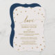 Esta tarjeta de invitación a la boda de "amor" es perfecta para una elegante boda. El diseño es sencillo y está decorado con confeti de oro de moda sobre un fondo de champán cremoso con una hermosa caligrafía de Relieve metalizado de oro falso y un respaldo azul marino. Nota: Este diseño no tiene Relieve metalizado oro real. Es un gráfico de alta calidad hecho para parecer un Relieve metalizado dorado. Para más opciones de redacción de la invitación a la boda, consulte la colección completa de puntos de polka oro boda: https://www.zazzle.com/collections/119263882092239442