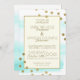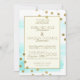 Invitación de boda de base acuática azul festiva y moderna enmarcada en oro y acentuada con puntos de confeti dorado impreso diseño invitación formal de boda.