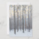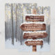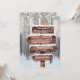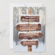 Invitaciones de boda de invierno mágico con un entorno romántico de bosque nevado, luces centelleantes y la información de su boda escrita en un letrero rústico de madera.