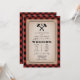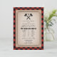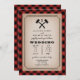 Invitación a una boda inspirada en el leñador, con un fondo de manto rojo y negro (búfalo) delante y detrás. El frontal presenta el ilustracion de dos ejes con monograma en la parte superior. Personalice el texto en el fondo inspirado en la burlap en el centro.