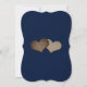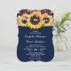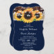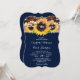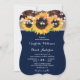 Una rústica invitación a una boda floral de color azul marino con girasoles y luces de cuerda contra un rústico fondo de madera, arpillera y encaje. Dos corazones en la espalda. Personalice fácilmente esta tarjeta boda con los detalles de su boda.