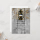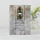 Boda gris rústica de madera de granero con un fondo de madera de granero desgastado y un farolillo dulce con un paisaje pintado, y una lluvia de confeti. La parte trasera de la invitación es de un tono verde salvia terroso, y un hermoso contraste.
