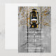 Boda gris rústica de madera de granero con un fondo de madera de revestimiento horizontal deteriorado con una linda linterna con un paisaje pintado en ella, y una lluvia de confeti. La parte trasera de la invitación es de un tono verde salvia terroso, y un hermoso contraste.