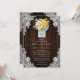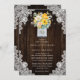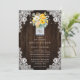 Invitación a una boda floral de color amarillo y melocotón con un ramo de flores y vegetación amarillas, melocotones y blancas dentro de un frasco de albañilería con iniciales y un fondo de madera de granero adornado con encajes florales blancos y luces de centelleo. Diseño perfecto para invitar a sus invitados a su fiesta de bodas rústica de color amarillo y melocotón.