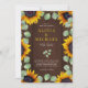 Elegante invitación a la boda rústica de estilo rústico con hojas de follaje de color agua eucalipto verde y marco de girasoles dorados amarillos y una tipografía de moda de moda sobre un fondo de madera marrón. ++++++++++ Es adecuado para la primavera, el verano y el otoño para bodas rústicas en el jardín, celebraciones al aire libre en el patio o en la casa de campo, fiestas de pareja o aniversarios.