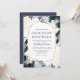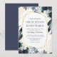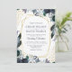 Tarjetas de invitación de boda elegantes en azul marino con un fondo blanco de moda que se puede cambiar a cualquier color, flores de acuarela azules boho rústicas, un marco geométrico dorado, brillo dorado y una plantilla de boda moderna.