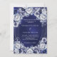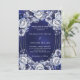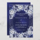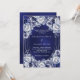 Para una boda de invierno. Un fondo azul marino, de colores desiguales, decorado con flores azules y blancas. Un falso marco oval plateado. Personalice y agregue sus nombres y detalles.