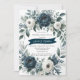 Un boda sofisticado con una corona floral de color azul marino adornada con peonías exuberantes, rosas y eucalipto verde en tonos azul marino, verde y marfil. El diseño se realza con una caja impresa de color gris plateado debajo de la corona con un diseño de texto de fuente moderno. La parte trasera de la invitación continúa con el tema con un arreglo floral a juego para un aspecto cohesivo y elegante. Perfecto para parejas que buscan una papelería boda atemporal y elegante.
