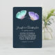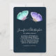 Invitación a la boda con un delicado diseño romántico. 2 mariposas acuarelas, pintadas, violetas y verdes. Fondo de color azul oscuro.