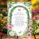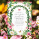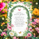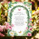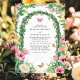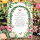 Invite a sus huéspedes con esta encantadora invitación a celebrar bodas en el jardín, con un exuberante arco de vegetación y flores vibrantes, con delicadas mariposas revoloteando por todos lados. El fondo blanco y nítido del arco realza la frescura y la belleza del diseño, lo que lo hace perfecto para un boda al aire libre o de primavera. Esta invitación captura el romanticismo de un jardín en plena floración, ideal para las parejas que aprecian la naturaleza y la elegancia.