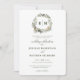 Esta hermosa invitación a una boda floral blanca y verde presenta una corona floral blanca que rodea un monograma moderno con un fondo blanco brillante. Los detalles de la invitación están escritos en oliva e incluyen caligrafía de estilo con letras a mano en verde oliva. Puede personalizar esta elegante invitación con todos sus detalles importantes de boda. En la parte trasera hay un marco floral de coordinación y hay espacio para los nombres de la novia y del novio. Esta invitación se coordina con los demás productos de la Colección de Bodas Florales Botánicos Blancos.