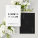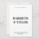Esta invitación a la boda presenta un diseño limpio y minimalista con tipografía atrevida y centrada, utilizando fuentes serif grandes para los nombres de la pareja y texto pequeño y en mayúsculas para los detalles del evento, todo con un sencillo fondo blanco. La parte posterior tiene fondo negro con 2 monograma inicial.