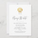 Una boda playera moderna, simple, elegante y minimalista cambia la tarjeta de la invitación de dátiles con una falsa imagen rústica de la concha dorada y un capricho caligráfico, y un polvoriento fondo sólido azul en la parte trasera. Parte de una colección de invitaciones de bodas de playa modernas y de moda en la tienda Zazzle Designer Destinos de uva de papel. Las fuentes y el color de fondo se pueden editar con el diseñador avanzado, sólo tiene que hacer clic en 'personalizar más adelante'.