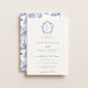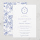 Invitación de boda con monograma de cresta azul Regencia. Cresta de monograma de arte lineal barroco de la era Regencia inspirada en el vintage. Características, un estilo de diseño de tipografía azul elegante mezcla de escritura y tipo en negrita. Estilo chinoiserie de patrón de jardín de respaldo.