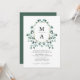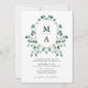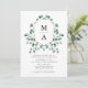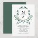 Invitaciones a bodas elegantes y a la moda con sus iniciales en monograma enmarcadas por una insignia de Relieve metalizado dorado falsa adornada con eucalipto verde polvoriento pintado a mano y follaje. Personalice las invitaciones de boda de eucalipto añadiendo fecha de boda, ubicación de boda, etc.