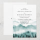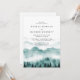 La elegante y rústica invitación de boda presenta una montaña con acuarela con árboles y las iniciales de la novia y el novio en la parte posterior.