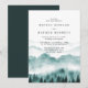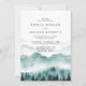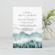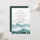Invitación de boda elegante y rústica con montaña de acuarela con árboles y tipografía clásica.