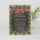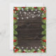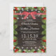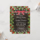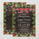Invitaciones de boda de invierno con un fondo de madera rústica oscura, follaje verde de Navidad, adornos rojos de árbol, luces centelleantes, una cinta de gingham y una plantilla de celebración festiva que es fácil de personalizar.