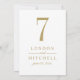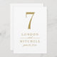 La elegante y elegante tarjeta de boda de oro antiguo de la mesa tiene un hermoso diseño de monograma de tipografía minimalista. El texto del personalizado y el número de la tabla se pueden personalizar completamente con los nombres de la novia y del novio y la fecha del boda. Hay que tener en cuenta que cada tarjeta de número de tabla debe ser personalizada y agregada individualmente al carrito de la compra (1,2,3...etc.). Por favor, compre nuestra Colección de Bodas de Oro Clásico Elegante para coordinar diseños.