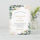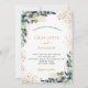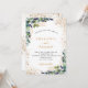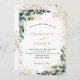 Un fondo blanco decorado con vegetación eucaliptos y follaje dorado. Personalice y agregue sus nombres y detalles del boda. Letras de color negro y dorado.