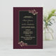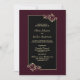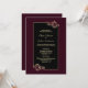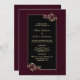 Una elegante invitación a bodas burdeos, negras y doradas que incluye información detallada sobre la ceremonia y los lugares de recepción.