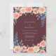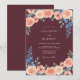 Este diseño presenta un fondo rico en borgoña que embellece y contrasta con rosas de durazno exuberantes y delicadas flores rosadas. Tallos de delfinium azul profundo y hojas de salvia verde apagado añaden un toque de color contrastante y textura orgánica. La estética de acuarela sombría crea una atmósfera romántica y sofisticada para un evento nocturno.