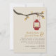 Invitación a una boda al aire libre en otoño con un tema de naturaleza salvaje/camping que incluye el ilustracion de una lámpara de aceite rojo colgando de una rama de árbol con hojas naranjas y marrones. Personalice el texto con su información.