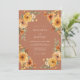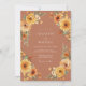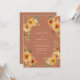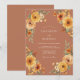 Este diseño presenta una estética cálida y terrenal perfecta para una ceremonia de matrimonio de fin de temporada. Un rico fondo de terracota proporciona un telón de fondo impactante para los vibrantes arreglos florales de mostaza amarilla y crema. Rosas pintadas a mano con acuarela y dalias soleadas están acentuadas por suaves hojas de eucalipto verde salvia y delicadas ramitas de bayas. La colocación orgánica de la flora crea una atmósfera rústica y sofisticada.