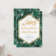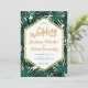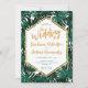 Esta invitación a una boda tropical presenta un esquema de colores verde y blanco. Para el encabezado y los nombres de la pareja se utiliza una tipografía de guión dorado tierno, y en sans-serif están los detalles del evento, incluyendo la ubicación, fecha, hora y RSVP. El fondo está formado por un hexágono con un borde de Relieve metalizado de imitación dorada y hojas de palmera verdes de estilo tropical veraniego. ・・・ Para más suites bodas, visite mi tienda Zazzle.com/EventsByJessicaAmber ・・ Para órdenes de personalizados, envíeme un mensaje a Zazzle