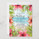 Sumérjase en un paraíso insular con esta invitación a bodas de playa tropical. Con sus vibrantes hibiscos y hojas de palma sobre un fondo de playa acuarela, esta invitación capta la belleza de los trópicos. Con su diseño exótico y llamativo, esta invitación es perfecta para una escapada romántica de boda y hará que sus invitados se entusiasmen por su día especial y un poco de sol, arena y mar.