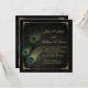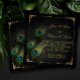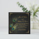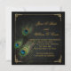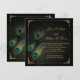 Hermoso fondo de purpurina negro y blanco con elegantes invitaciones de boda de plumas de pavo real verdes esmeralda y doradas. Esta invitación de boda de pavo real elegante se personaliza fácilmente para su evento. Puede eliminar la imagen de fondo de la parte posterior si desea elegir su propio color de fondo como negro.