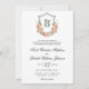 Esta hermosa invitación a una boda con escudo floral de durazno con las iniciales de la novia y el novio sería perfecta para su boda. Su redacción es tradicional pero moderna y los tipos de letra son exquisitos. Las peonías onduladas, rosas, flores silvestres, lirios del valle y una vegetación espeluznante son románticas y elegantes.