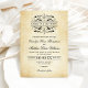 Los torbellinos y floridos negros decorativos enmarcan este elegante diseño de la tipografía vintage de la boda. El fondo rústico de marfil está impreso con un papel de pergamino envejecido en textura. Personalice el elegante monograma y el texto del personalizado para su ceremonia de boda y recepción.