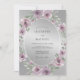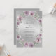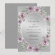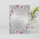 Este diseño presenta un fondo metálico plateado brillante que crea una atmósfera sofisticada. Delicadas rosas de acuarela en tonos de malva polvoriento y lavanda están dispuestas elegantemente, complementadas con suaves hojas verdes de salvia. La paleta de tonos fríos y púrpuras suaves evoca un ambiente romántico y elegante adecuado para un evento de alta gama.
