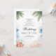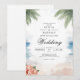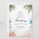 Captura la esencia de una unión costera con este diseño sereno. Los suaves lavados acuáticos evocan aguas tranquilas y arena suave, enmarcados por frondosas palmeras. Un ambiente tranquilo y romántico para su día especial.