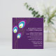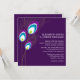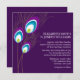 La elegante y clásica invitación presenta un hermoso ilustracion vectorial de plumas de pavo real sobre un fondo violeta profundo. Perfecto para bodas, duchas de novias, fiestas de cumpleaños, dulces dieciséis fiestas y más!