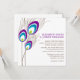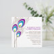 La elegante y clásica invitación presenta un hermoso ilustracion vectorial de plumas de pavo real sobre un fondo violeta profundo. Perfecto para bodas, duchas de novias, fiestas de cumpleaños, dulces dieciséis fiestas y más!