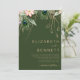 Pavo de pavo real Oscuro Diseño Boda Feathers con floral de coral, plumas de pavo real verde azuladas de azul profundo y líneas botánicas extravagantes sobre un fondo verde de bosque oscuro.