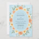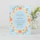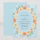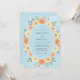 Este diseño presenta un fondo suave de azul claro adornado con un exuberante arreglo de rosas de durazno en acuarela y flores silvestres amarillas soleadas. El follaje verde exuberante y las delicadas ramitas se entrelazan a través del despliegue floral para crear una atmósfera luminosa y aireada. La paleta de colores de azul pastel, naranja cálido y dorado evoca un estado de ánimo alegre de primavera.