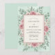 Este diseño presenta un suave fondo verde menta adornado con un exuberante arreglo de rosas rosadas polvorientas y follaje de eucalipto salvia. La estética acuarela romántica crea una atmósfera etérea perfecta para un evento de temporada. La paleta equilibra tonos pastel con delicados detalles botánicos.