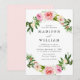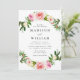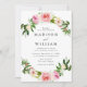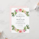 Elegantes invitaciones de boda florales con un spray de flores color agua rosadas y rubias con hojas verdes vívidas en la parte superior e inferior de la invitación. Personaliza las invitaciones de boda añadiendo tus nombres, la fecha y hora, el nombre del lugar, etc. La invitación se invierte a un fondo rosa rubor.