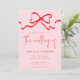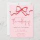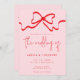 El diseño de la invitación a la boda muestra una audaz lazo rojo sobre un suave fondo rosa. Combinado con fuentes elegantes y un guión funky, ofrece una moda moderna y encantadora para cautivar a los destinatarios. Este estilo único marca la pauta para una celebración apasionante, deleitando a los huéspedes al recibir la tarjeta.
