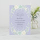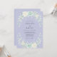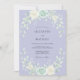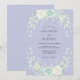 Este diseño presenta un suave fondo de lavanda adornado con delicadas rosas de acuarela en tonos de crema y verde menta. El follaje exuberante y las ramitas de eucalipto crean una estética botánica romántica perfecta para un evento de primavera o verano. La paleta de colores etérea de púrpura pastel y salvia proporciona un ambiente sereno y sofisticado.
