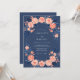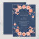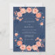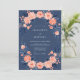Este diseño muestra un fondo azul marino profundo combinado con un arreglo vibrante de rosas melocotón y coral. El follaje azul oscuro crea una estética botánica temperamental y sofisticada adecuada para ceremonias de invierno o formales. Los detalles suaves de acuarela y los elementos florales floreciendo proporcionan una apariencia romántica y atemporal. La paleta rica y los acentos florales evocan una atmósfera de elegancia.