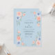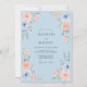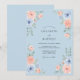 Este diseño muestra una paleta azul cielo tranquila adornada con suaves rosas de acuarela en tonos de melocotón y pervinca. Delicadas hojas de eucalipto y exuberante vegetación acentúan las esquinas, creando una estética botánica romántica. El estilo etéreo pintado a mano es ideal para un evento elegante de primavera o verano.