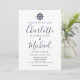 Con la rueda de un barco y los nombres de estilo de firma, esta elegante invitación de boda náutica se puede personalizar con su información en elegante letra azul de la marina. Diseñado por Thisisnotme©