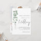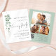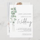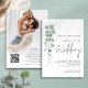 Moderno Eucalyptus Foto Sobrepuesta Elegante Boda De Sabio Script. Elegante estilo botánico minimalista, con un guión manuscrito para Boda y el resto del texto que se puede personalizar fácilmente. Una elegante rama de las hojas de eucalipto acuarela corre por el lado izquierdo. Reemplace la imagen de ejemplo en la parte posterior por la suya propia.
