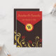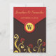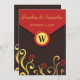 Sobre Swirls Floral: Rojo marrón y amarillo - © Diseños Sunny Mars. Personalizable elegante formal de 7" x 5" invitación a la boda personalizada con un diseño de sobre marrón y rojo, un botón de monograma y remolinos florales amarillos y rojos de bonito.